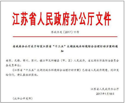 今年1月18日江蘇省政府辦公廳正式出臺的《江蘇省“十三五”太湖流域水環境綜合治理行動方案》(以下簡稱《方案》)將成為接下來一段時間內治太的重要依據。